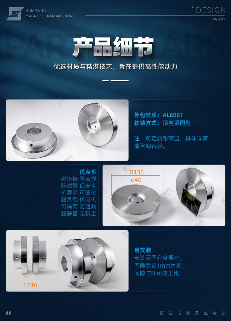 磁力聯(lián)軸器(Magnet Coupling),特別適用于中低速正反轉(zhuǎn)的輕型設(shè)備, 磁力聯(lián)軸器屬于非接觸式動(dòng)力傳遞裝置。 目前在核電、 航天航空、 生物醫(yī)療、海洋裝備、石油化工、實(shí)驗(yàn)室真空等設(shè)備都有著廣泛的應(yīng)用。