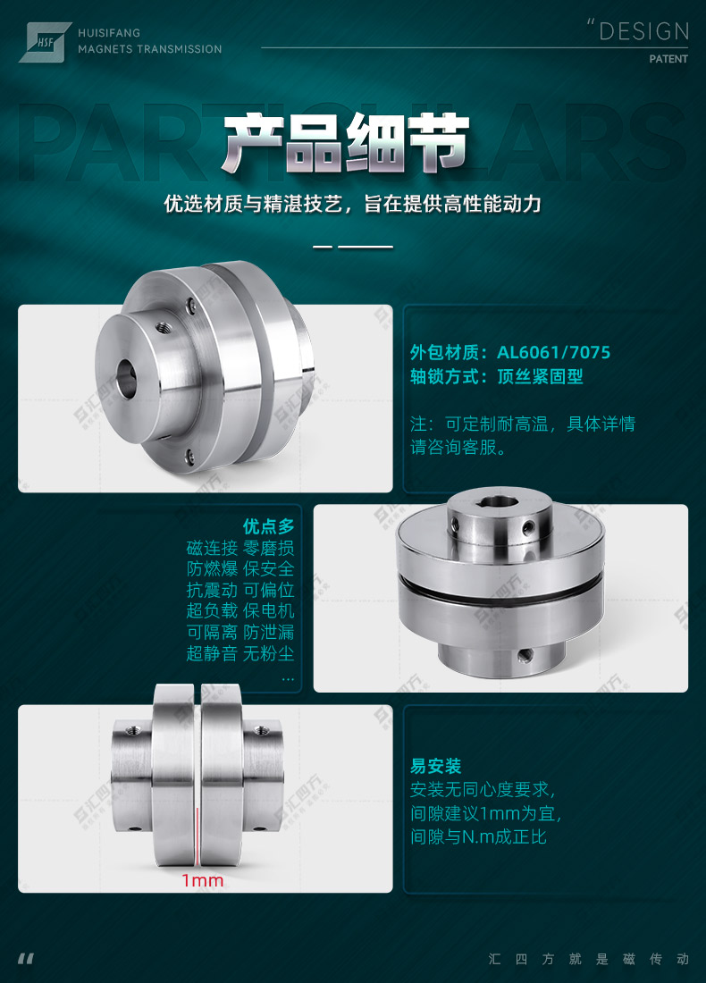 渦流磁力耦合器(Eddy Current Magnetic Coupling),靜止?fàn)顟B(tài)下無軸向吸力,安全裝配;動(dòng)力端轉(zhuǎn)速越高,被動(dòng)端扭矩會(huì)隨之增大;不必?fù)?dān)心被動(dòng)端產(chǎn)生高溫影響傳動(dòng);任意起停時(shí)傳動(dòng)平穩(wěn),無抖動(dòng)現(xiàn)象。在一些不需要同步傳動(dòng),又要求傳動(dòng)絲滑的設(shè)備上有廣泛的應(yīng)用,如:代替?zhèn)鹘y(tǒng)接觸剎車。
