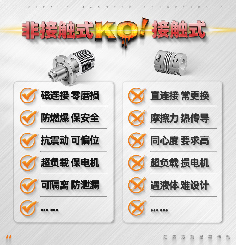 徑向磁力聯(lián)軸器(Radial Magnetic Coupling)內(nèi)轉(zhuǎn)與外轉(zhuǎn)子的中間安裝靜態(tài)法蘭隔離罩,無接觸傳動。特別適用于中速、低速、高速輕型設(shè)備,適合正反轉(zhuǎn)傳動。防止泄漏,避免發(fā)生安全事故,減少維護和停工更換成本。在核電、 航天航空、 生物醫(yī)療、海洋裝備、石油化工、實驗室真空等設(shè)備都有著廣泛的應(yīng)用。
