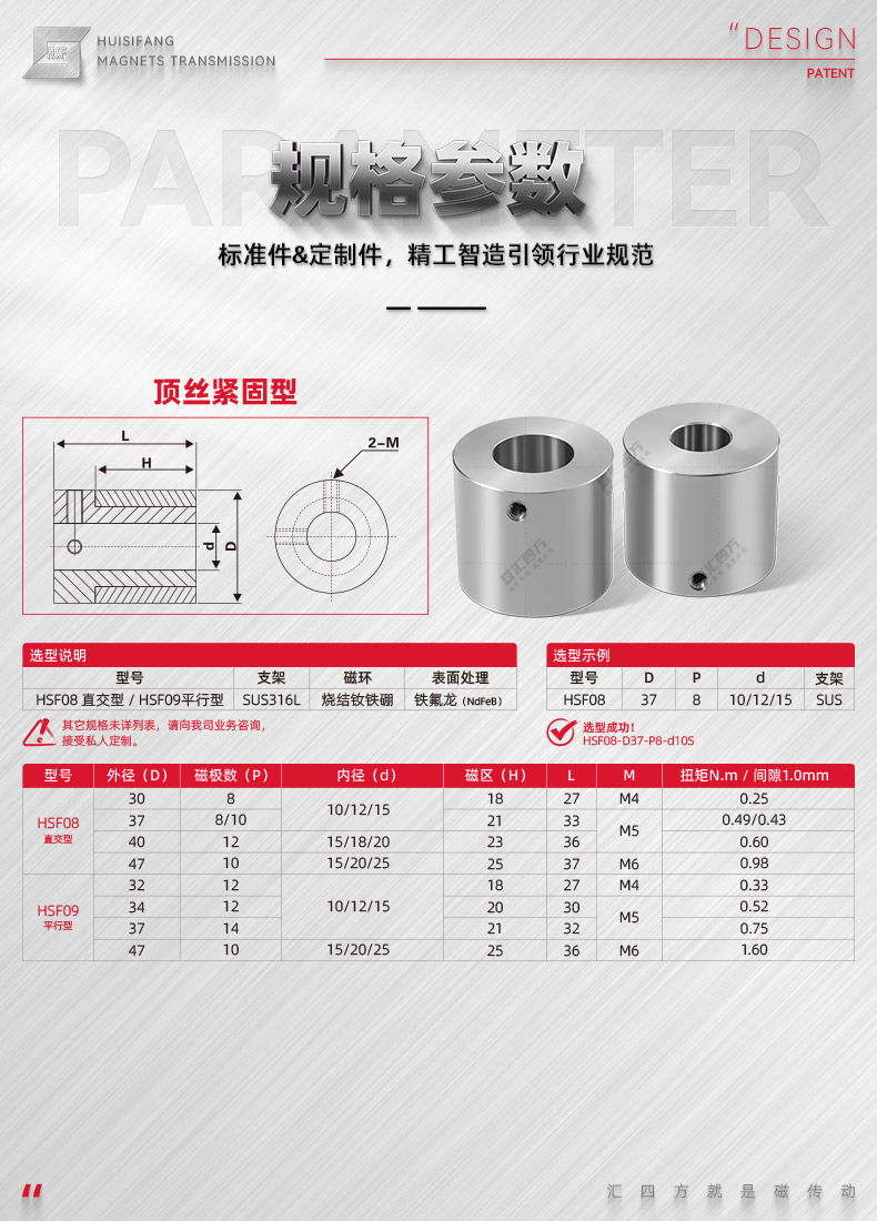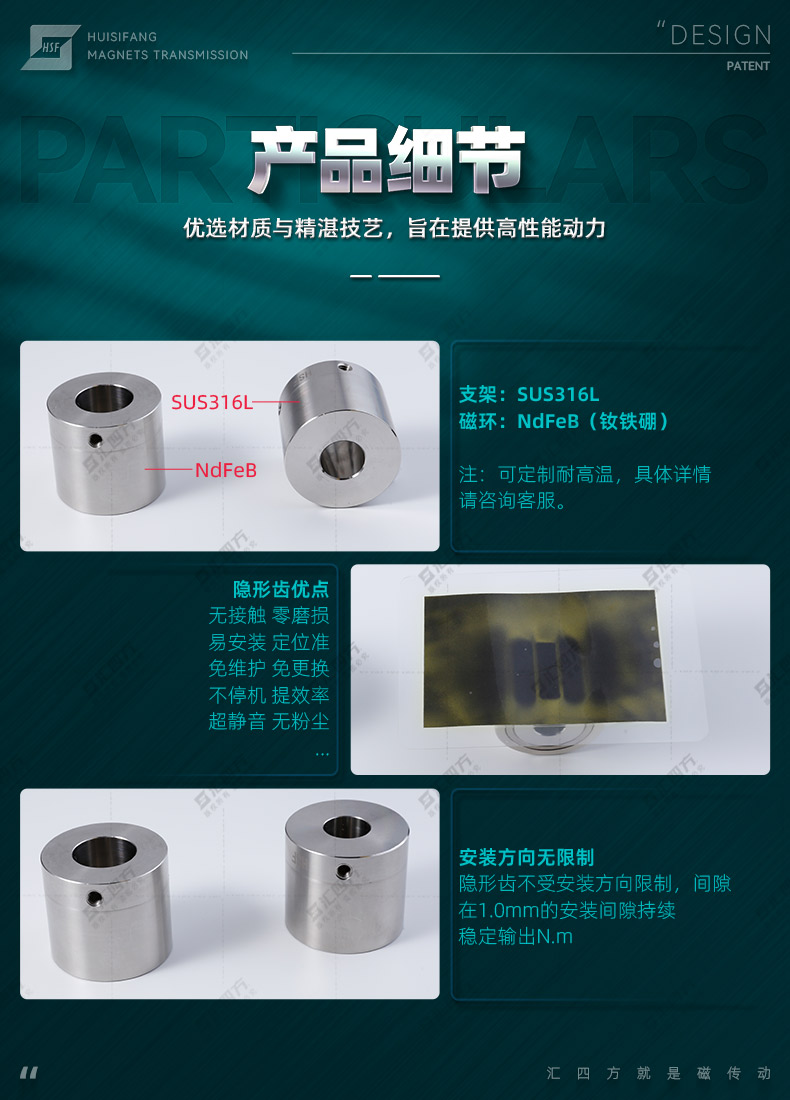 磁力輪(Magnet Gear)是利用釹鐵硼強(qiáng)鐵的吸力和斥力的相互作用原理,實(shí)現(xiàn)無(wú)接觸的動(dòng)力傳遞裝置。SUS316L耐酸堿液體、氣體腐蝕。
